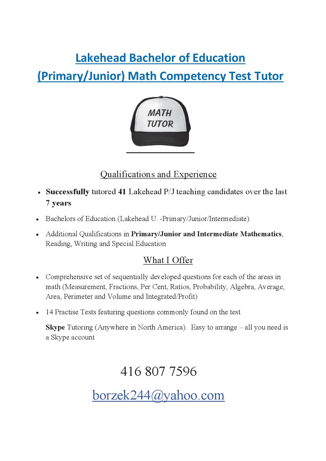 September 2016 Math Exam Results Available - Legacy 1 Year B.Ed Students (Concurrent)